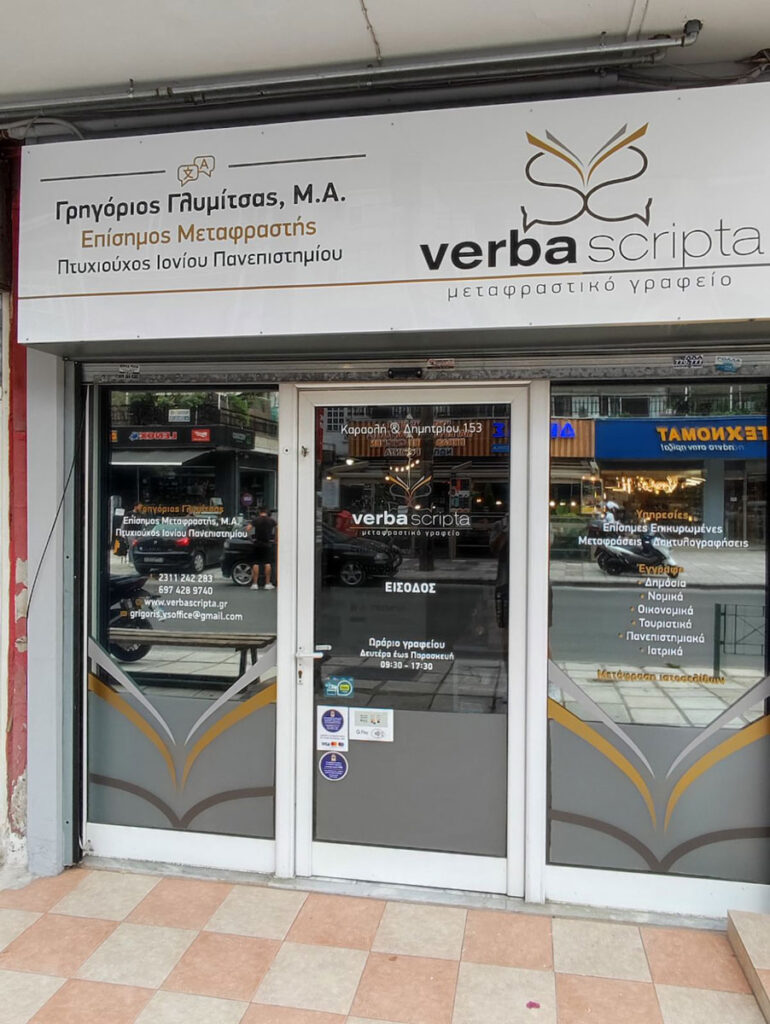 Das Übersetzungsbüro „Verba Scripta“ mit Geschäftssitz in Evosmos Thessaloniki, Griechenland, wird von Herrn Grigorios Glymitsas, offiziellem Übersetzer, Absolvent der Abteilung für Fremdsprachen, Übersetzen und Dolmetschen der Ionischen Universität, einem ordentlichen Mitglied des Panhellenischen Verbands der professionellen Übersetzer-Absolventen der Ionischen Universität (PEEMPIP) und des Panhellenischen Verbands der Übersetzer (PEM) geleitet. Die o.g. Verbände sind beide Mitglieder des Internationalen Verbands der Übersetzer (FIT). Herr Glymitsas ist auch ein akkreditierter Übersetzer bei dem Generalkonsulat von Deutschland und Frankreich in Thessaloniki.
